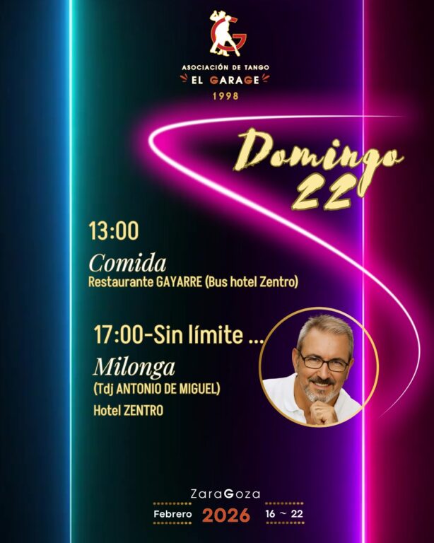 El broche final es la milonga de despedida a las 17 h, musicalizada por el TDJ Antonio de Miguel. ¡No te pierdas su mítico final de fiesta!