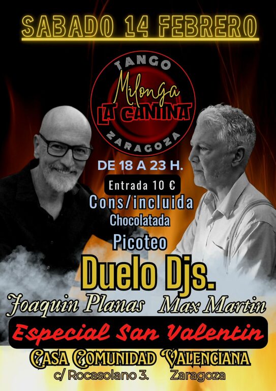 En este especial de San Valentín contaremos con un singular duelo de DJ, de la mano de dos de nuestros grandes musicalizadores de Zaragoza, Joaquín Planas y Max Martín, chocolatada y, como siempre, al finalizar haremos un picoteo para reponer fuerzas y seguir con otros ritmos.