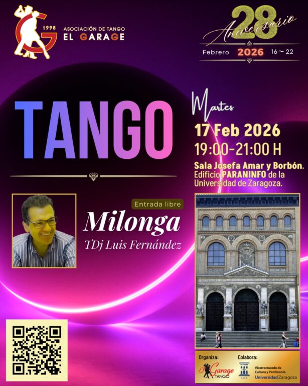Continuando con la celebración del XXVIII aniversario de la Asociación de Amigos del Tango El Garage, el martes 17 de febrero nos trasladamos a un lugar emblemático de la ciudad, el edificio Paraninfo. La Universidad de Zaragoza, siempre abierta a la vida cultural, nos cedió la sala Josefa Amar y Borbón, donde celebramos una milonga de 19 a 21 horas.