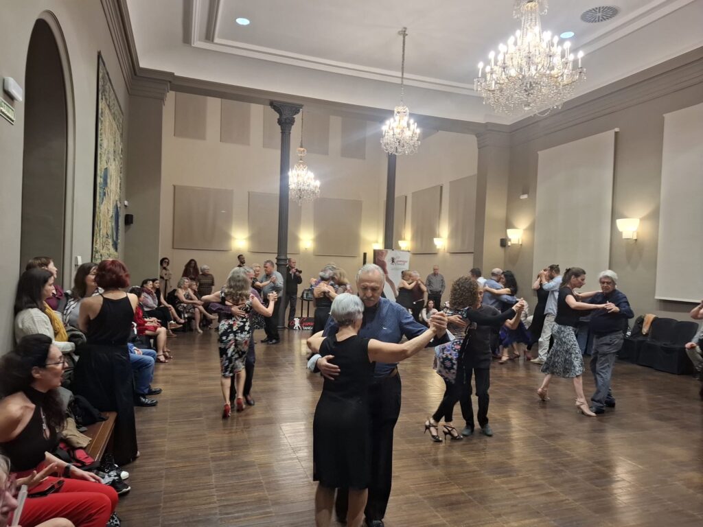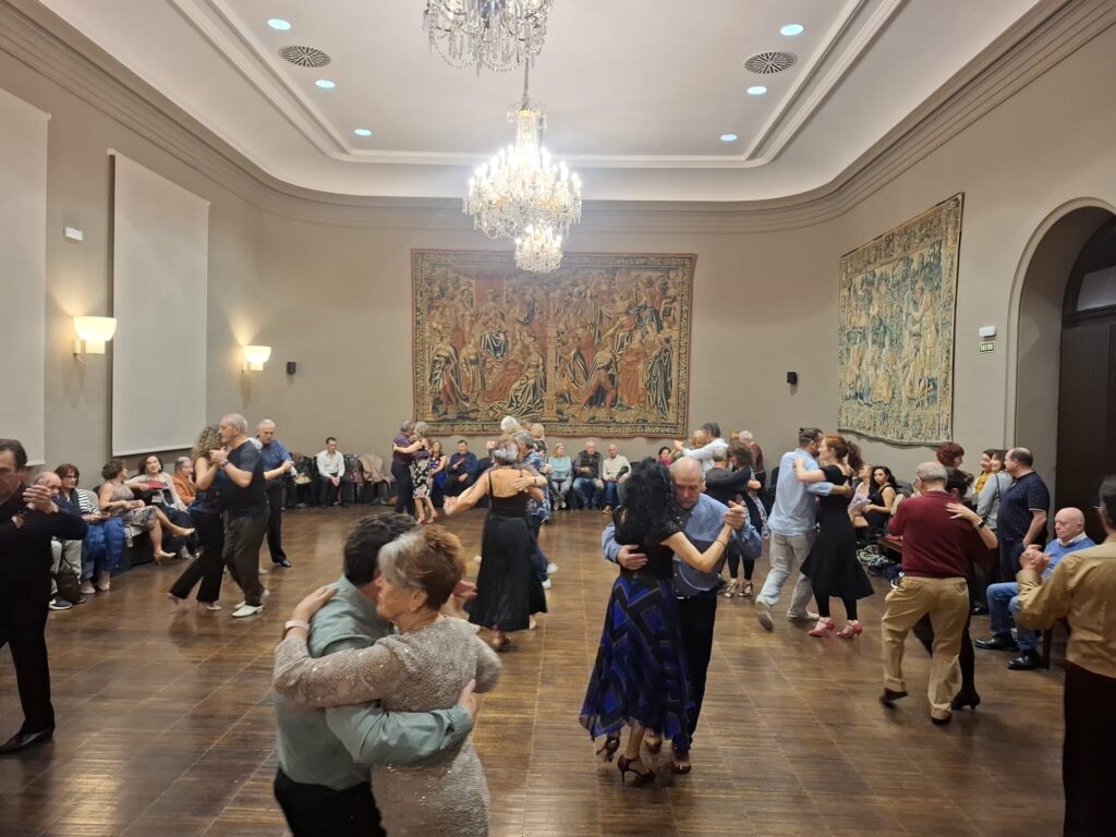 Dado que el Paraninfo es un espacio público, abierto a toda la ciudadanía, recibimos la visita de numerosos curiosos que disfrutaron de lo que para nosotros es una milonga y para ellos un bello espectáculo no habitual. La respuesta de los socios fue magnífica; tuvimos una elevada asistencia. La sala se quedó pequeña.